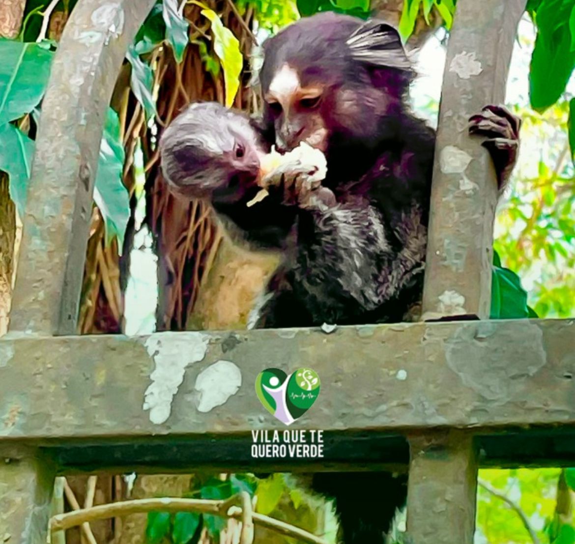 Durante a Semana do Dia das Crianças, a natureza nos presenteou com uma cena rara: uma fêmea de sagui-de-tufo-preto, do Cerrado baiano, alimentando seu filhote na Floresta Cultural da Vila São Francisco Adalgisa.