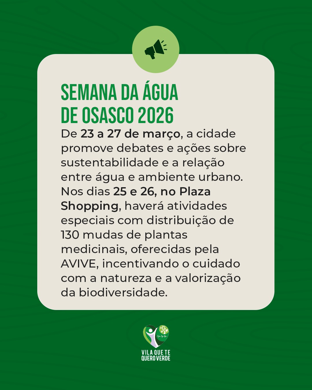 Nos dias 25 e 26 de março, a AVIVE estará presente na programação com a distribuição de 130 mudas de plantas medicinais, ação patrocinada pela instituição e voltada ao incentivo da biodiversidade e ao cuidado com a natureza. A iniciativa também busca valorizar espécies com potencial terapêutico e estimular a participação da população em práticas de preservação ambiental.